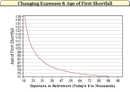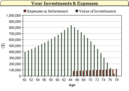 After taking into account investment gains, taxes, and inflation, you are estimated to run out of money by age 78. If expenses in retirement are 10% lower, you are estimated to run out of money by age 80. If expenses in retirement are 10% higher, you are estimated to run out of money by age 76.